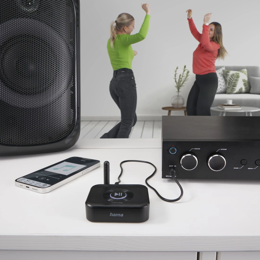 Para duas fontes áudio: o recetor Bluetooth permite ligar dois dispositivos, p. ex., dois telemóveis a uma coluna ou sistema estéreo — já não precisa de ligar e desligar cabos para conectar o Bluetooth
