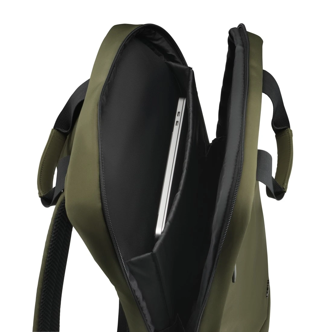 Conceção estruturada: a divisória na mochila executiva oferece espaço para canetas, pens USB, cartões de visita e afins, mas também para artigos pessoais como chaves, lenços e batons
