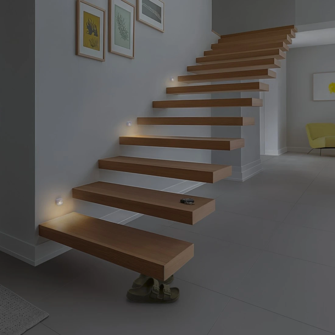 Detetor de movimento com sensor crepuscular e sistema de desativação automática para uma iluminação direcionada: A luz noturna reage ao movimento no escuro e liga-se automaticamente - a luz de orientação fica ligada por aprox. 20 segundos após a ativação
