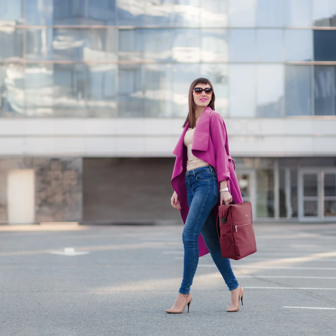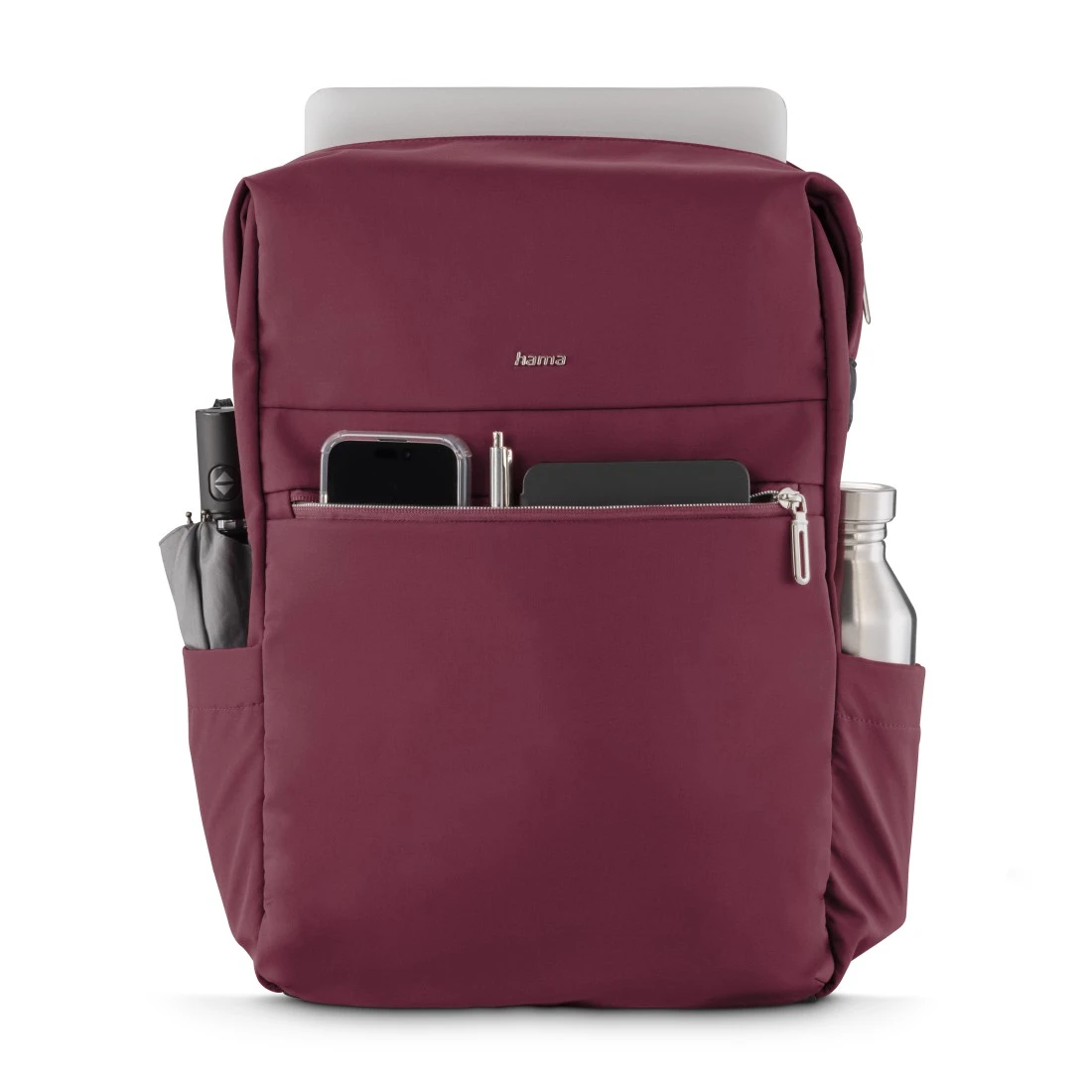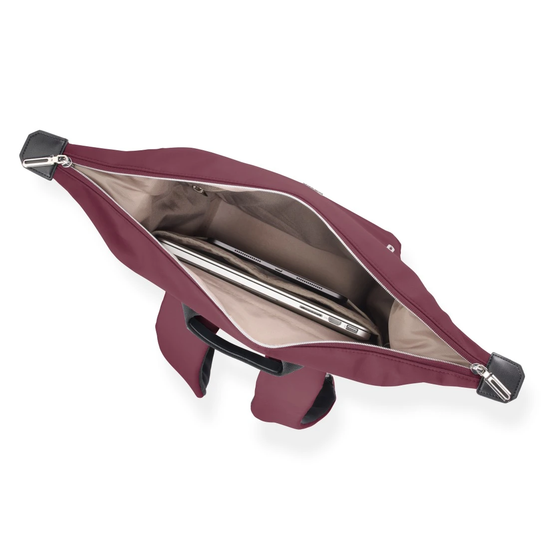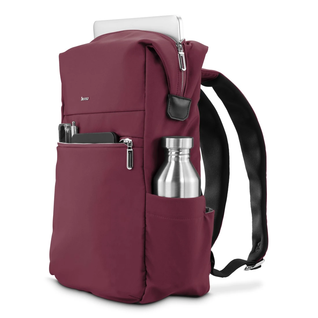 Compacto e seguro: As extremidades salientes do fecho de correr largo podem ser fixadas na parte lateral da mochila para computador portátil com ímanes - um pormenor de design útil em pele sintética